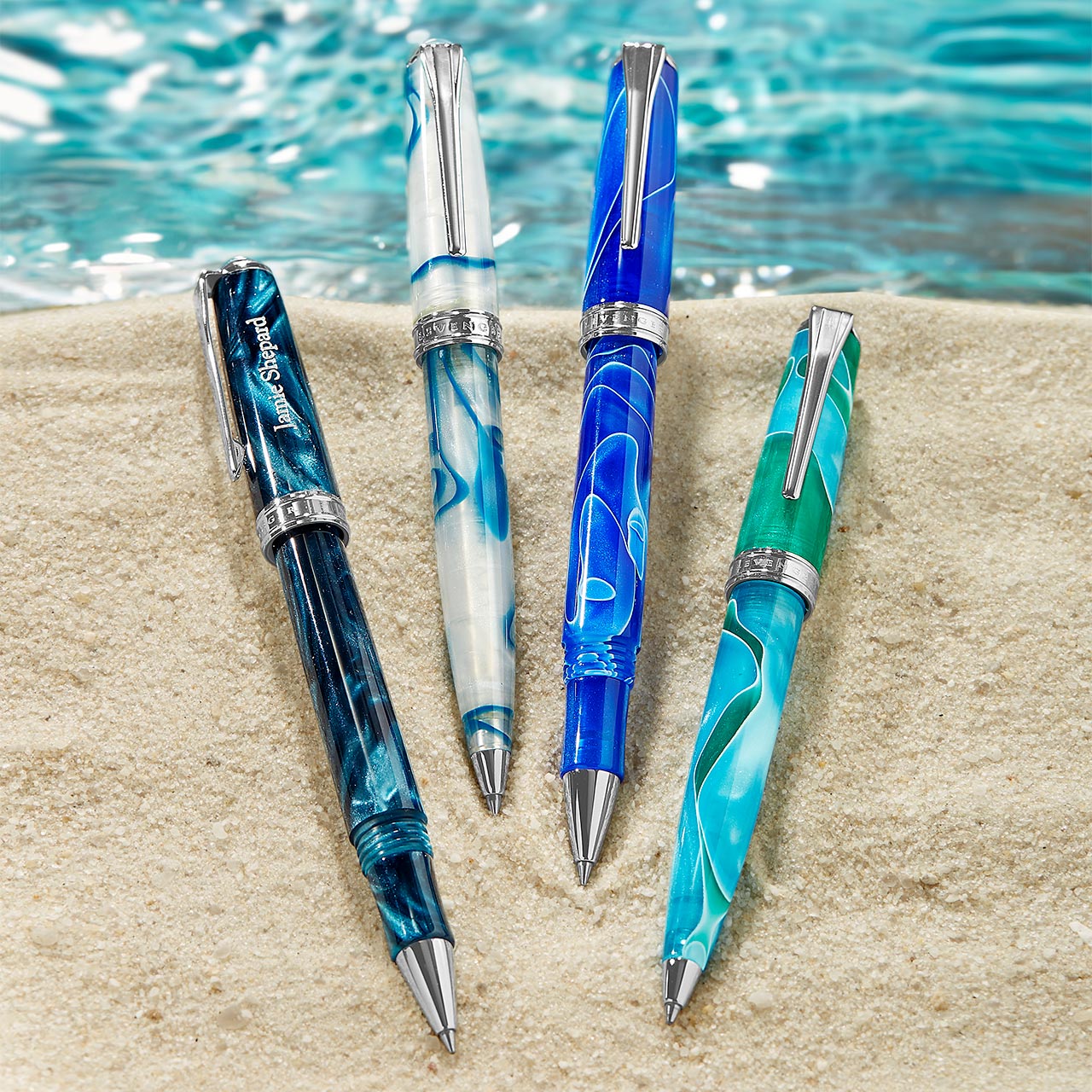 For the beachgoers and lovers of sand and surf on your gift list, any of our Seafarer Quartet would be a particularly evocative and apt gift choice. The Pacific has a deep moody blue and green swirled barrel. The Atlantic has a bright blue barrel streaked with white. The Mediterranean has delicate ripples of turquoise blue, green and white. The Caribbean has churning swirls of white and ocean blue. All styles have gleaming polished chrome appointments.