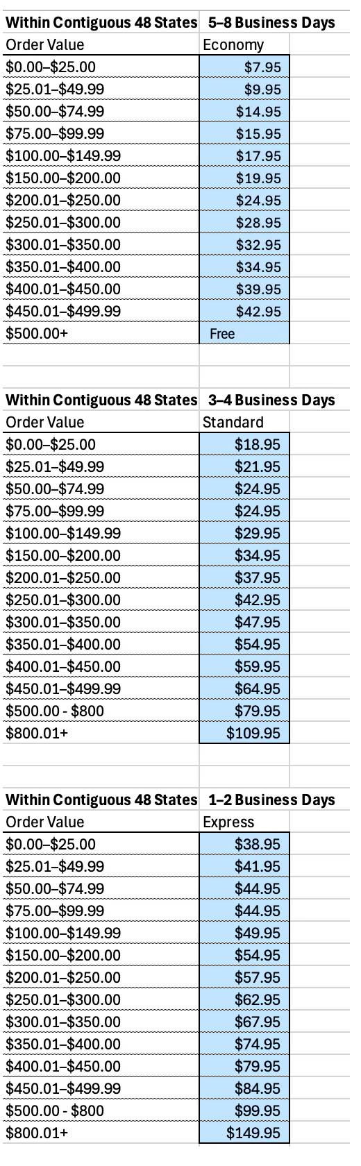 All orders totaling $500 or more Ship Free via Economy Ground Shipping to the 48 contiguous states.